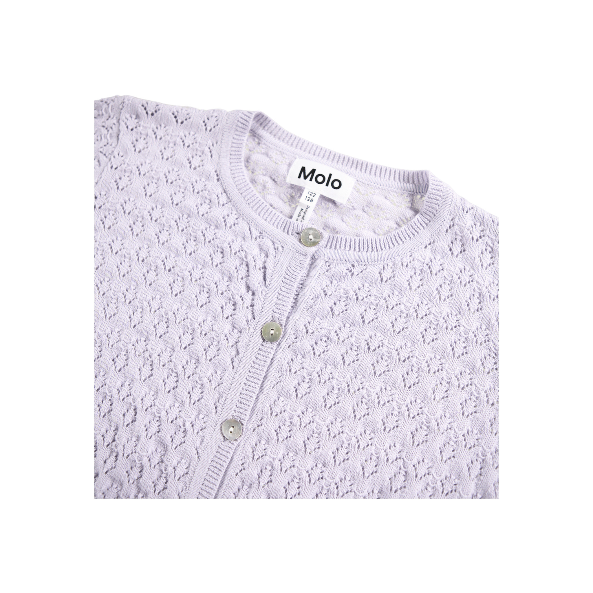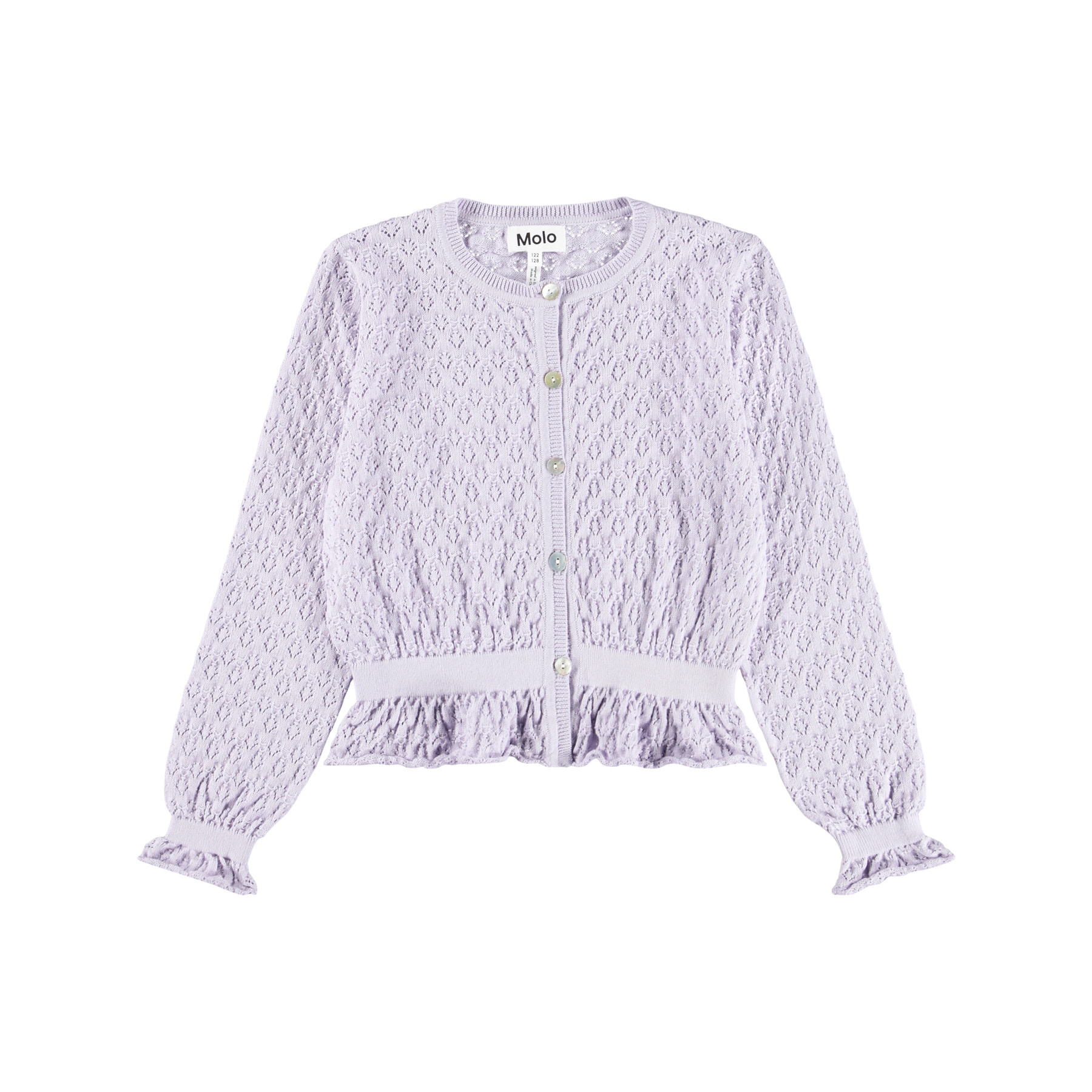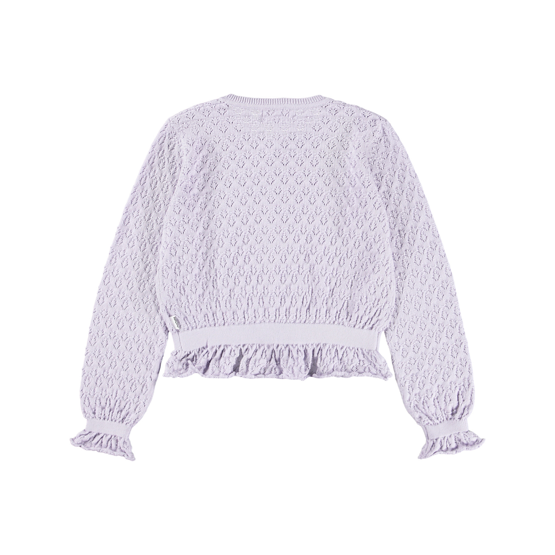 Feminine purple cardigan made of organic cotton. This cardigan has a beautiful flower-woven lace pattern, ribbed edges around the waist and sleeves for a nice fit, as well as a slightly gathered finish around the sleeves and waist. 100% Organic cotton.