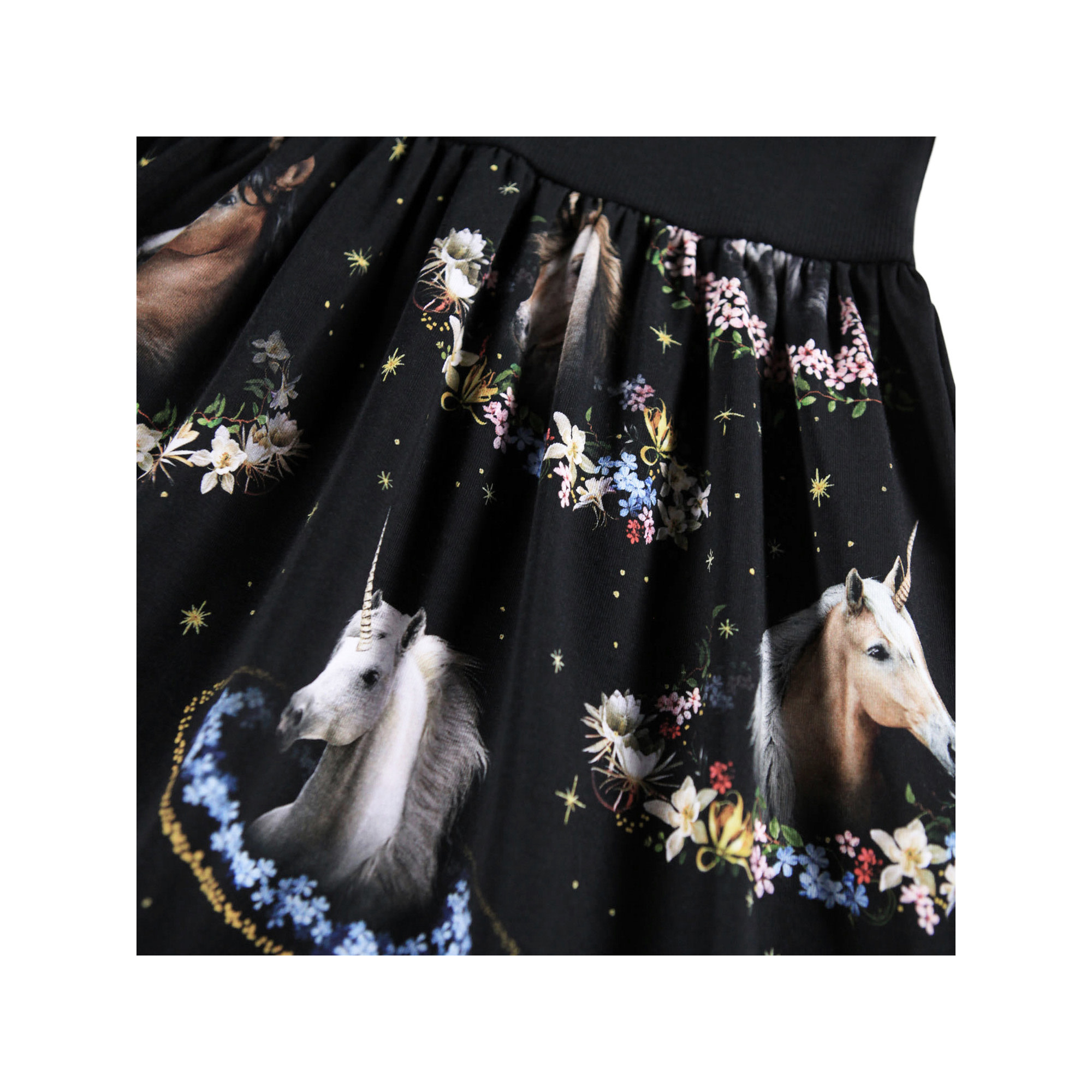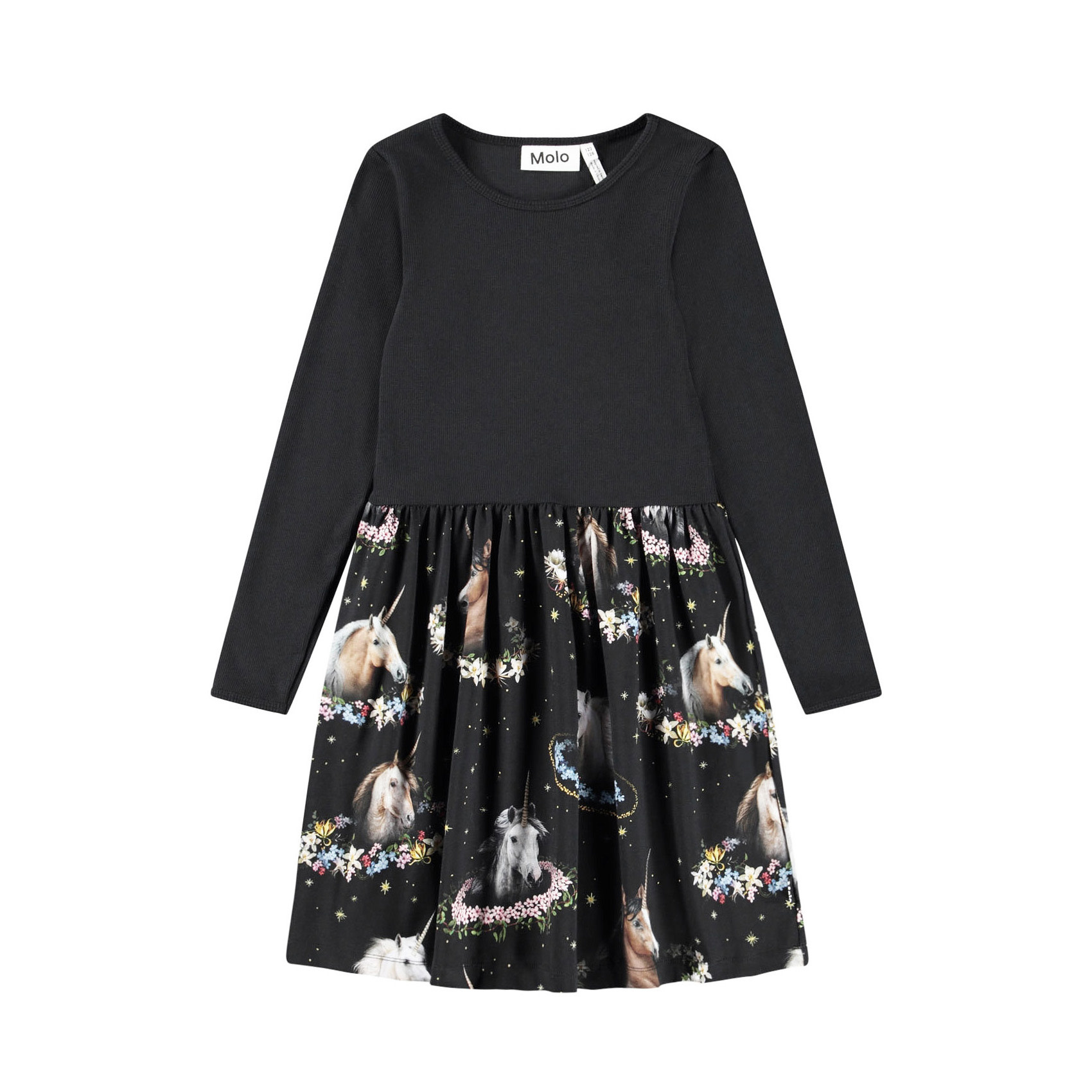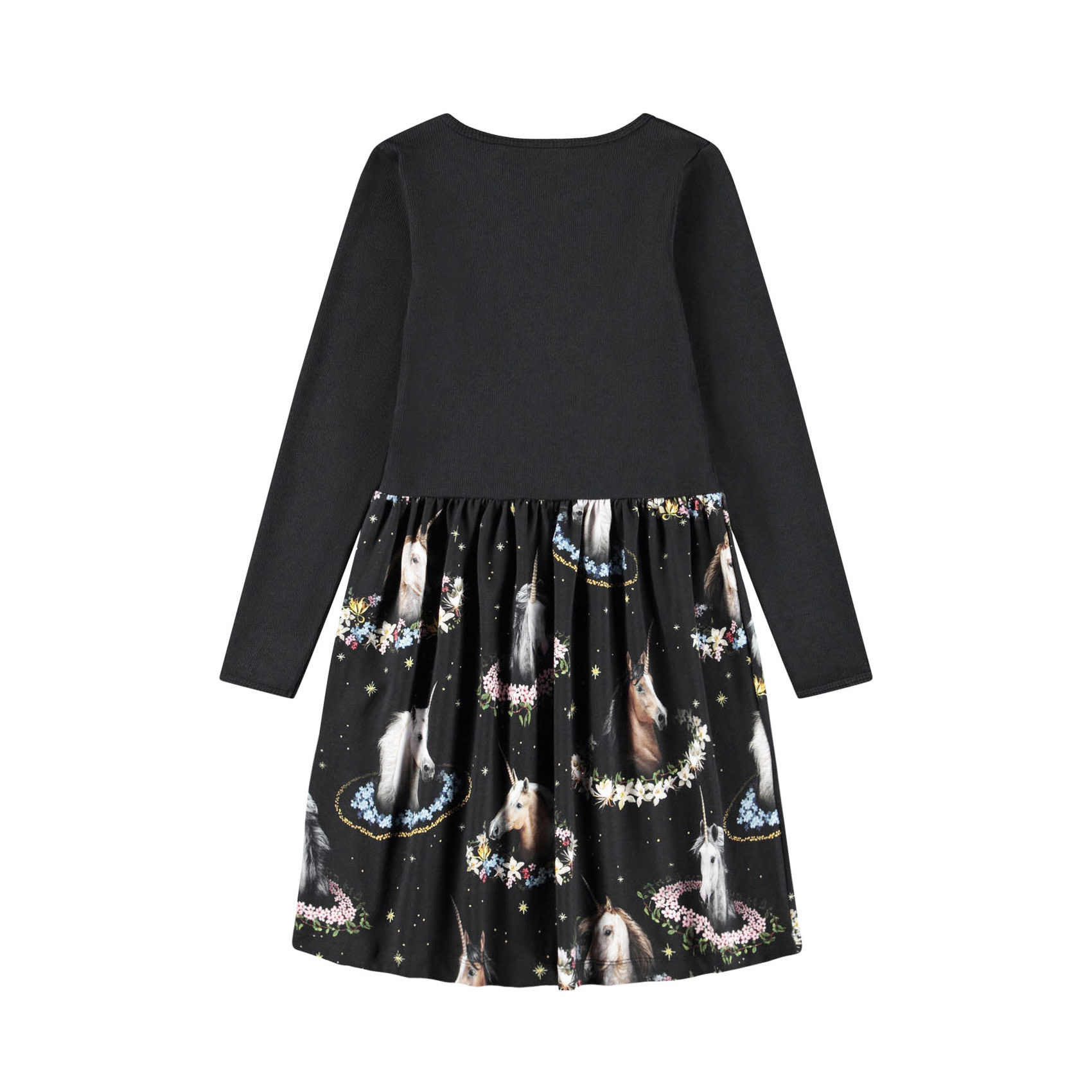 Black long-sleeved dress made of organic cotton, combining a close-fitting top in ribbed jersey with a smooth jersey skirt. The skirt has a print of unicorns and flowers.95% Organic cotton/ 5% Elastane