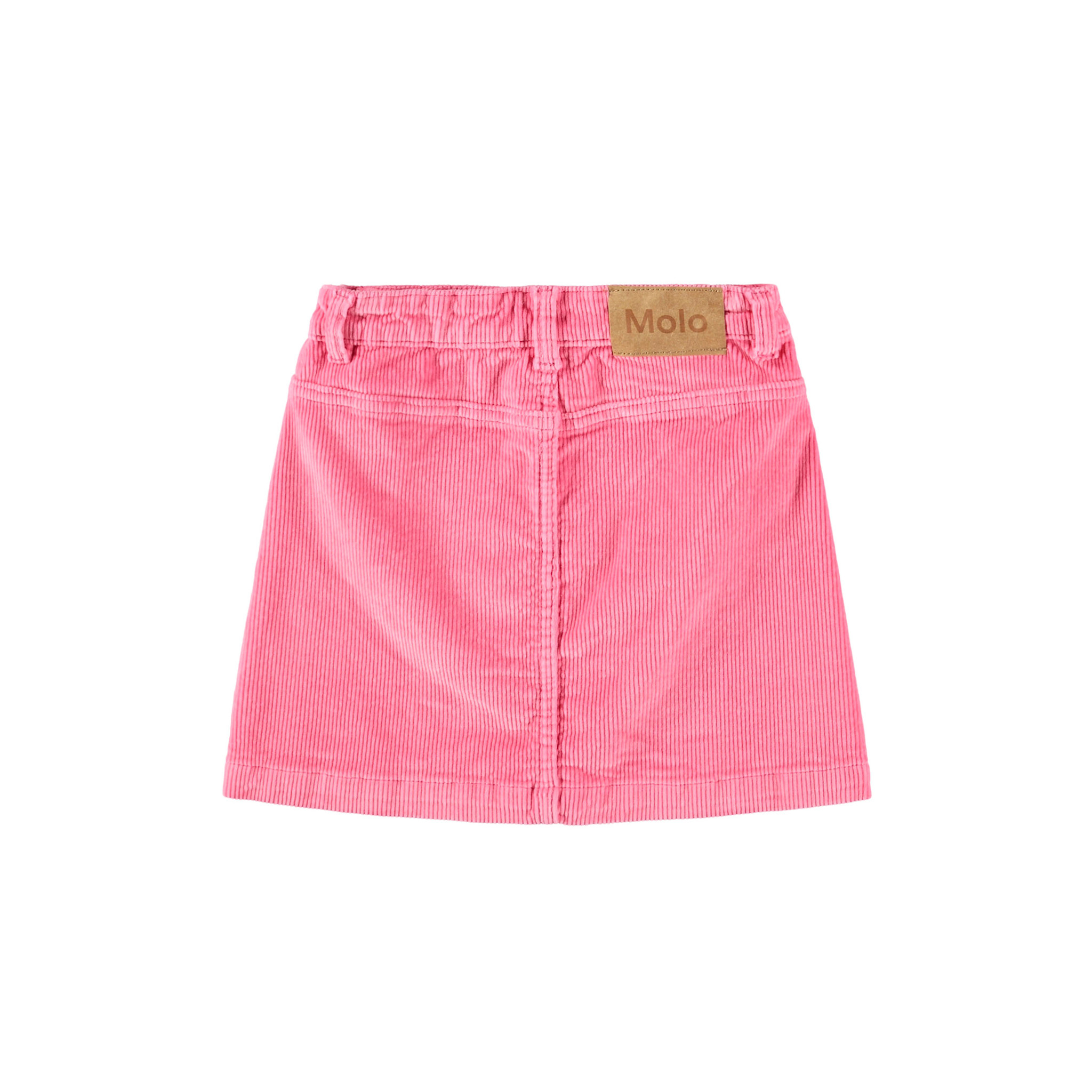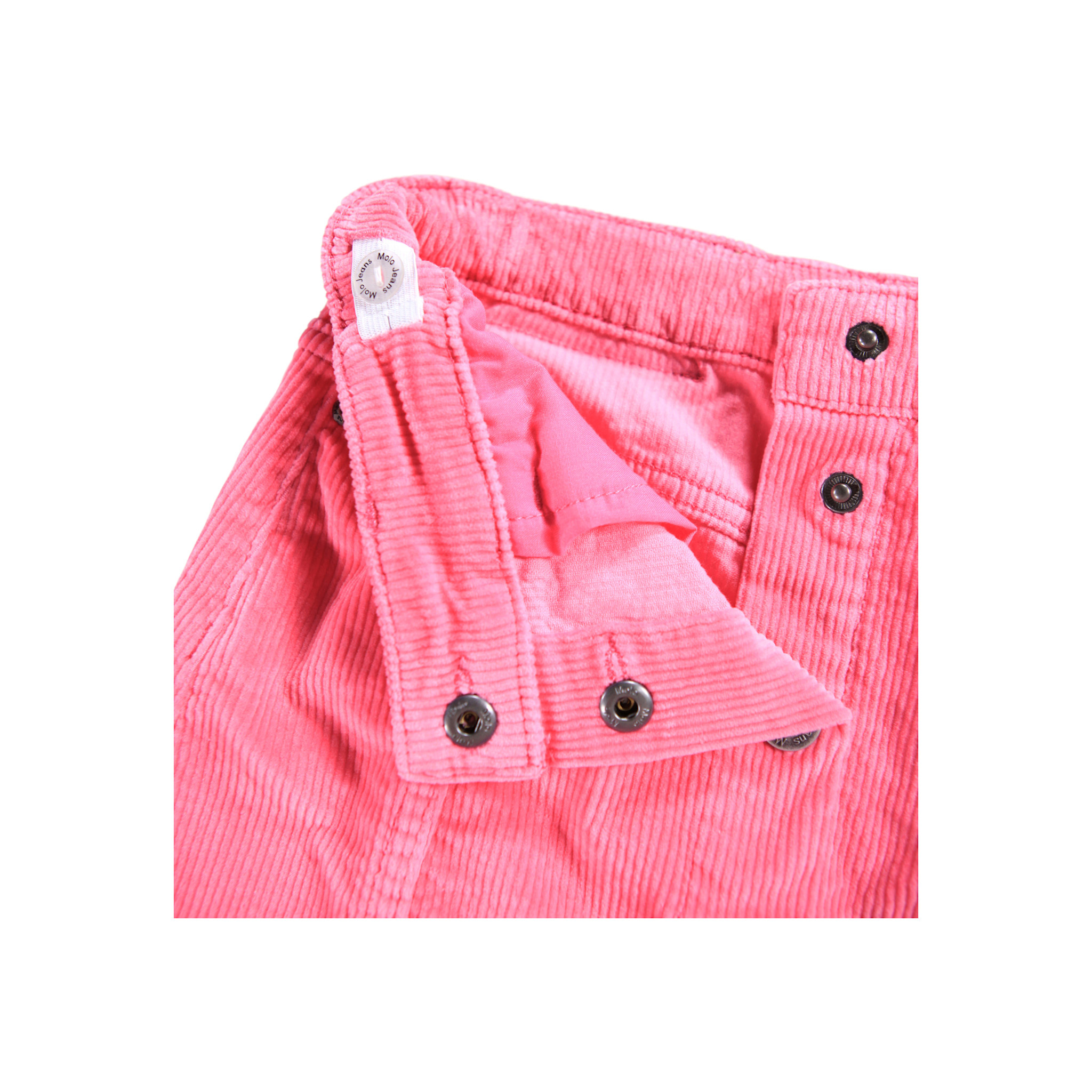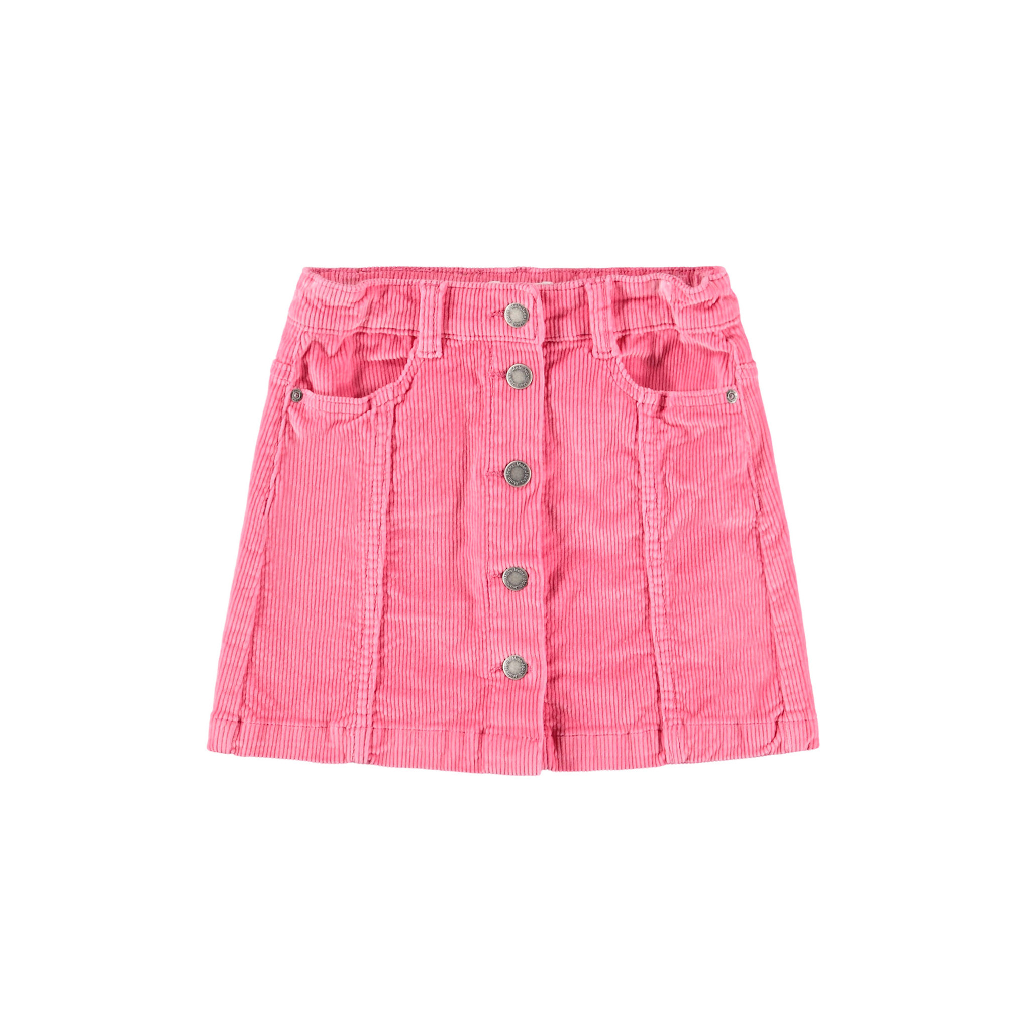 Confetti pink corduroy skirt with silver buttons for fastening. The skirt reaches mid-thigh and has a waist with belt loops and front pockets. The beautiful cut includes detailed stitching that runs from the pockets down. 100% Cotton.