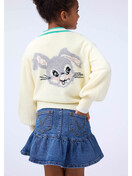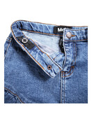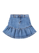 Blue denim skirt with a ruffle at the bottom. The skirt is knee-length and has both front and back pockets. It has a zip and snap button closure as well as belt loops. The waist has an internal adjustable elastic, so it can be adjusted for the right fit.