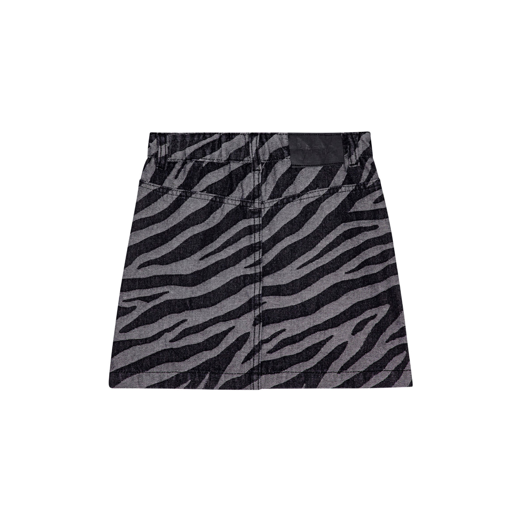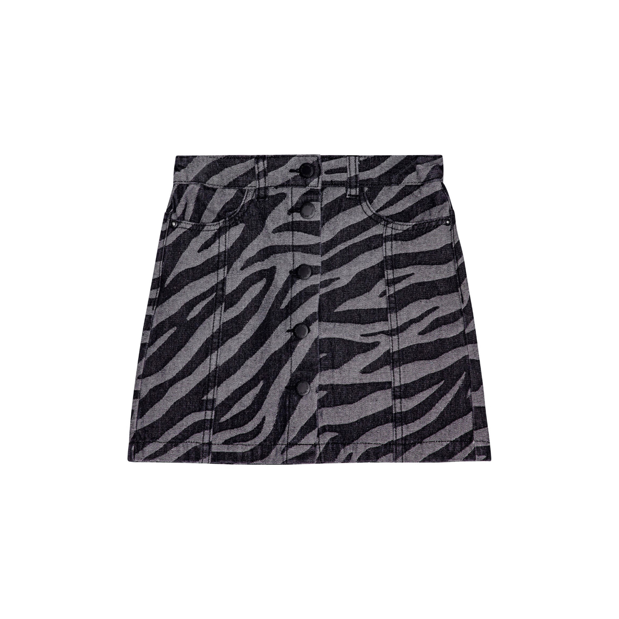 Zebra-striped denim skirt with black matte buttons for fastening. The skirt reaches mid-thigh, has a waist with belt loops and front pockets. The skirt has a stylish cut with decorative stitching from the pockets downwards. 90% Cotton / 10% Polyester