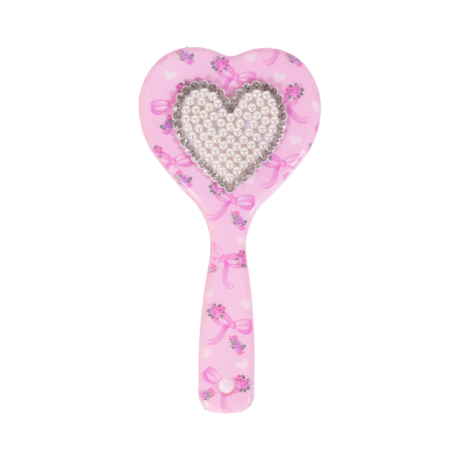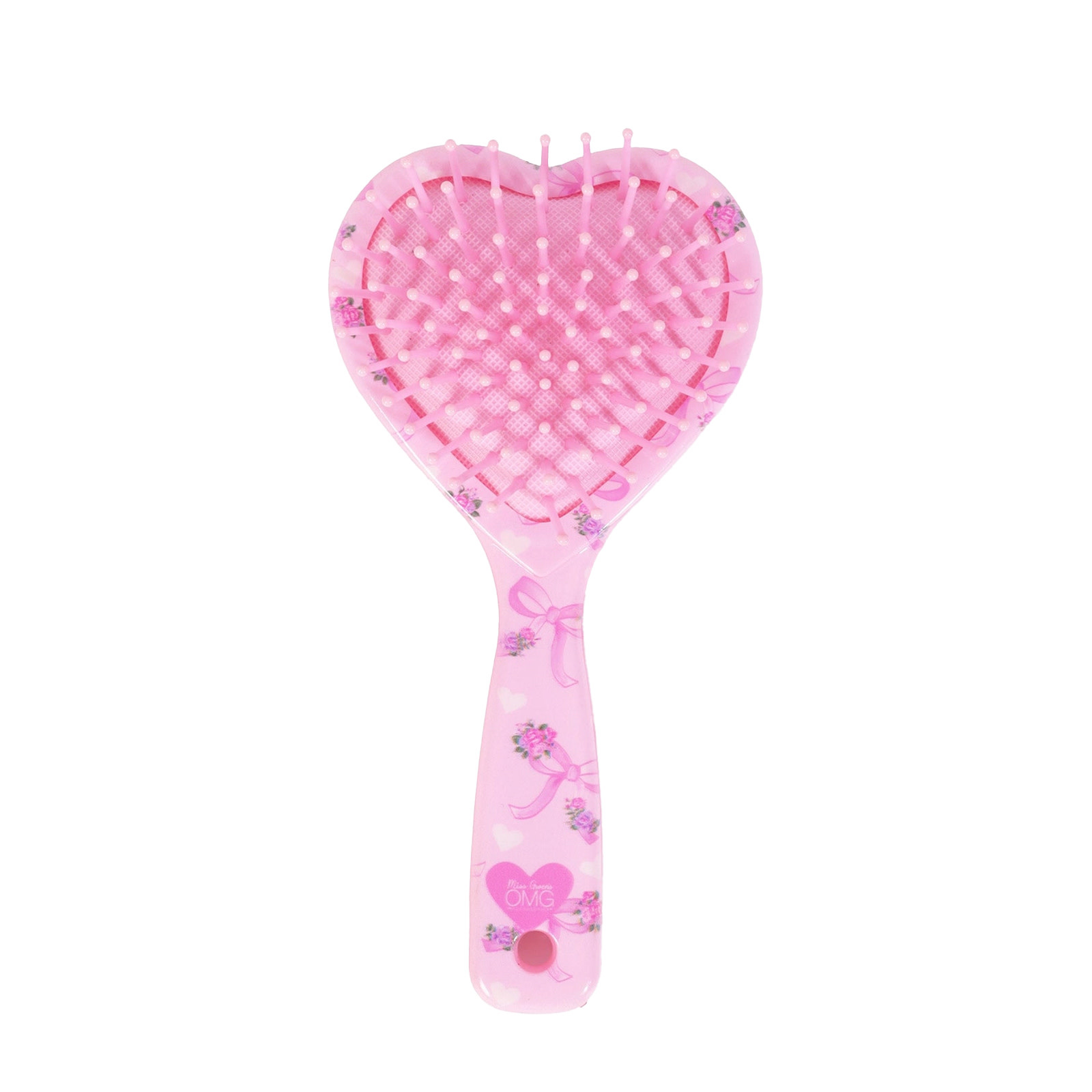 Dazzle and detangle with this bow printed heart-shaped mini hair brush. Topped with a pearl heart appliqué, it's petite size is perfect for little hands to get out those stubborn knots.