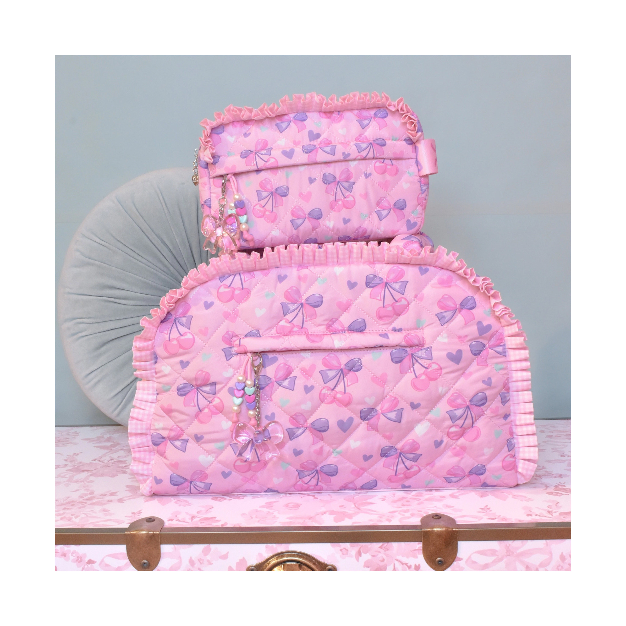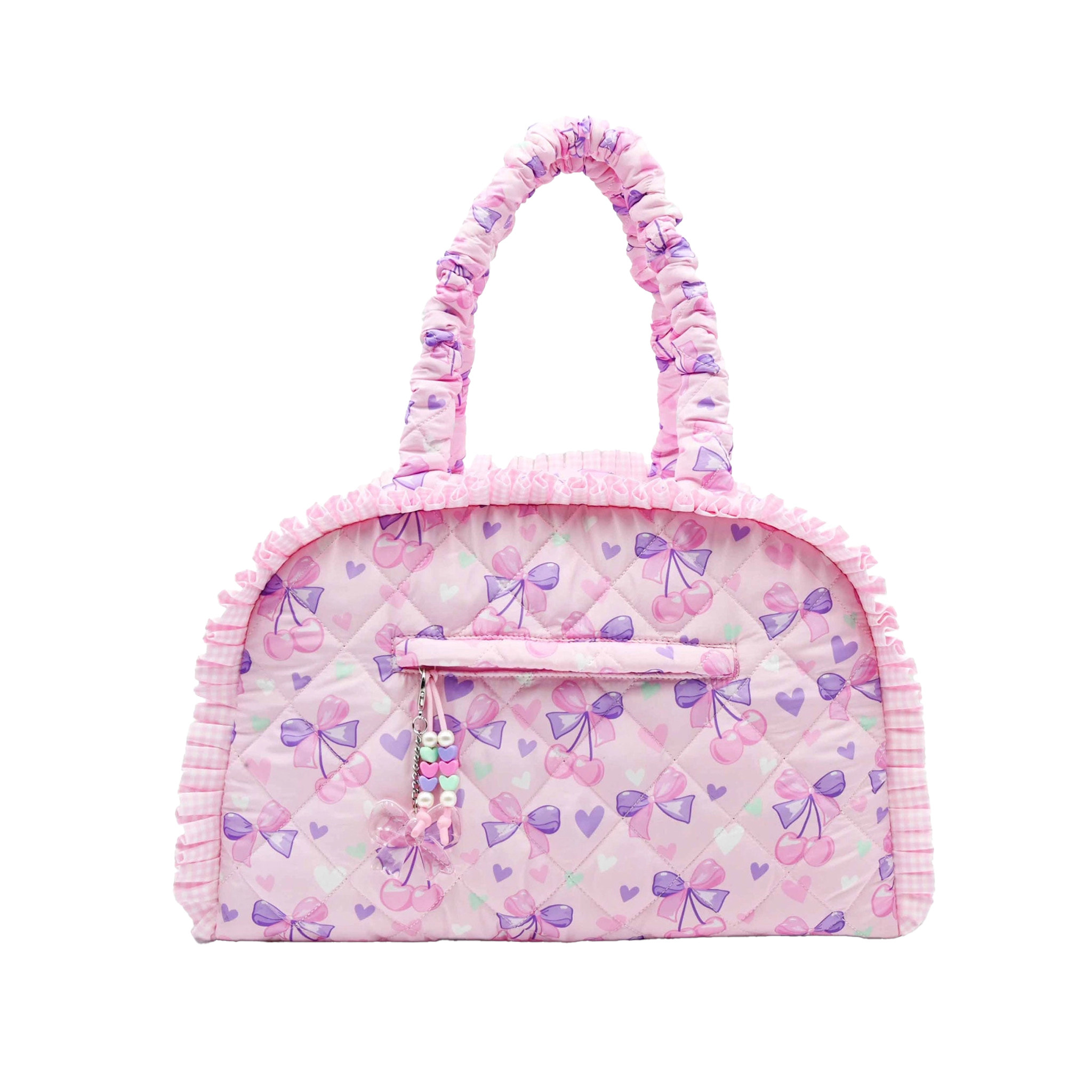 Travel in style with the Quilted Cherry Bow Printed Medium Duffle Bag from OMG Accessories. This weekender bag for kids is designed with a unique blend of big ideas and timeless inspiration. Measures 10.5 x 16.5 x 7.25 inches.