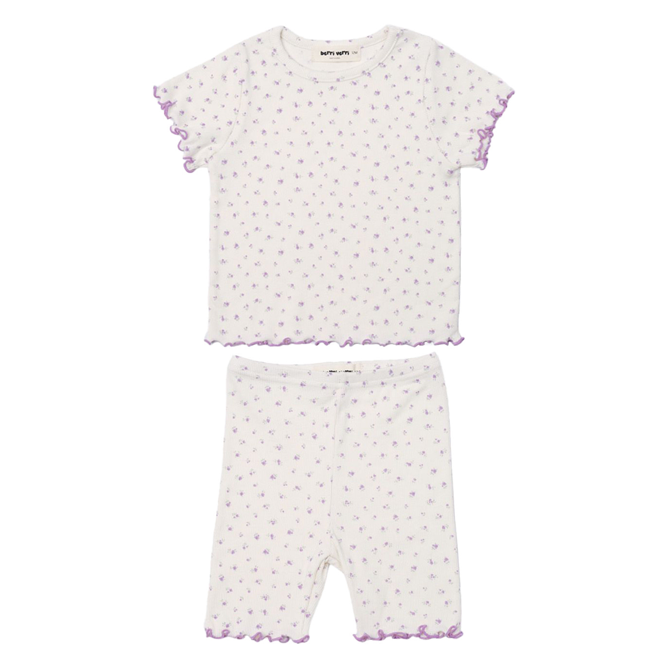 Petite Hailey purple floral ruffled trim top and short set. Soft cotton in purple floral pattern. Soft cozy material.