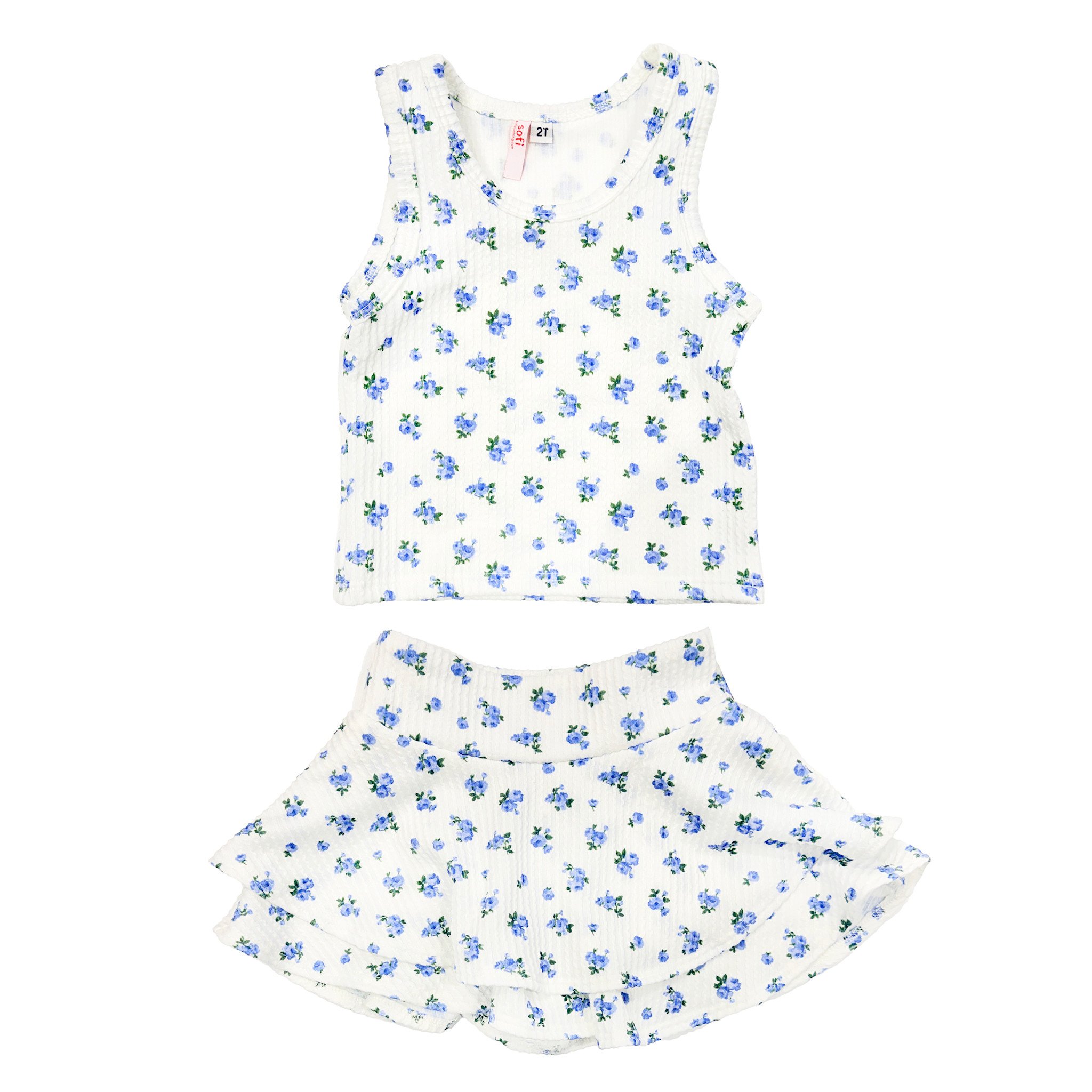 Sofi Kids white pointelle skirt with attached short in blue floral print.