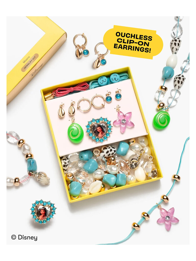 Set off on a crafting journey with the Moana Jewelry Kit, where creativity meets adventure! With a glowing Heart of Te Fiti pendant, a pink hibiscus charm, a sparkly Moana ring, & fun clip-on earrings with interchangeable charms.