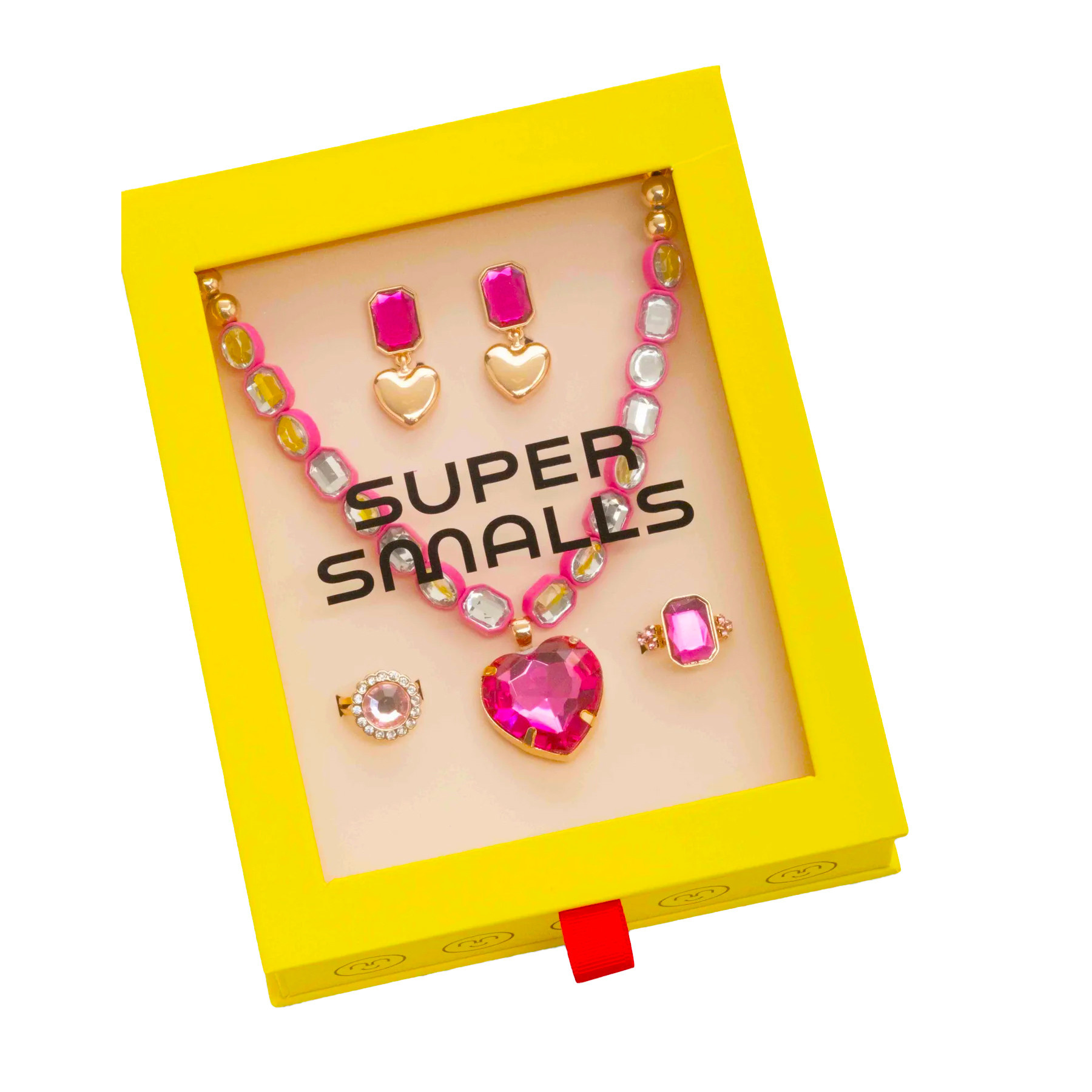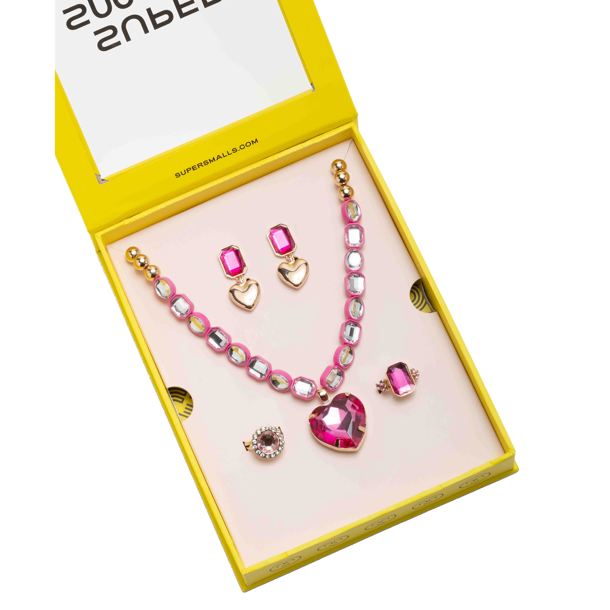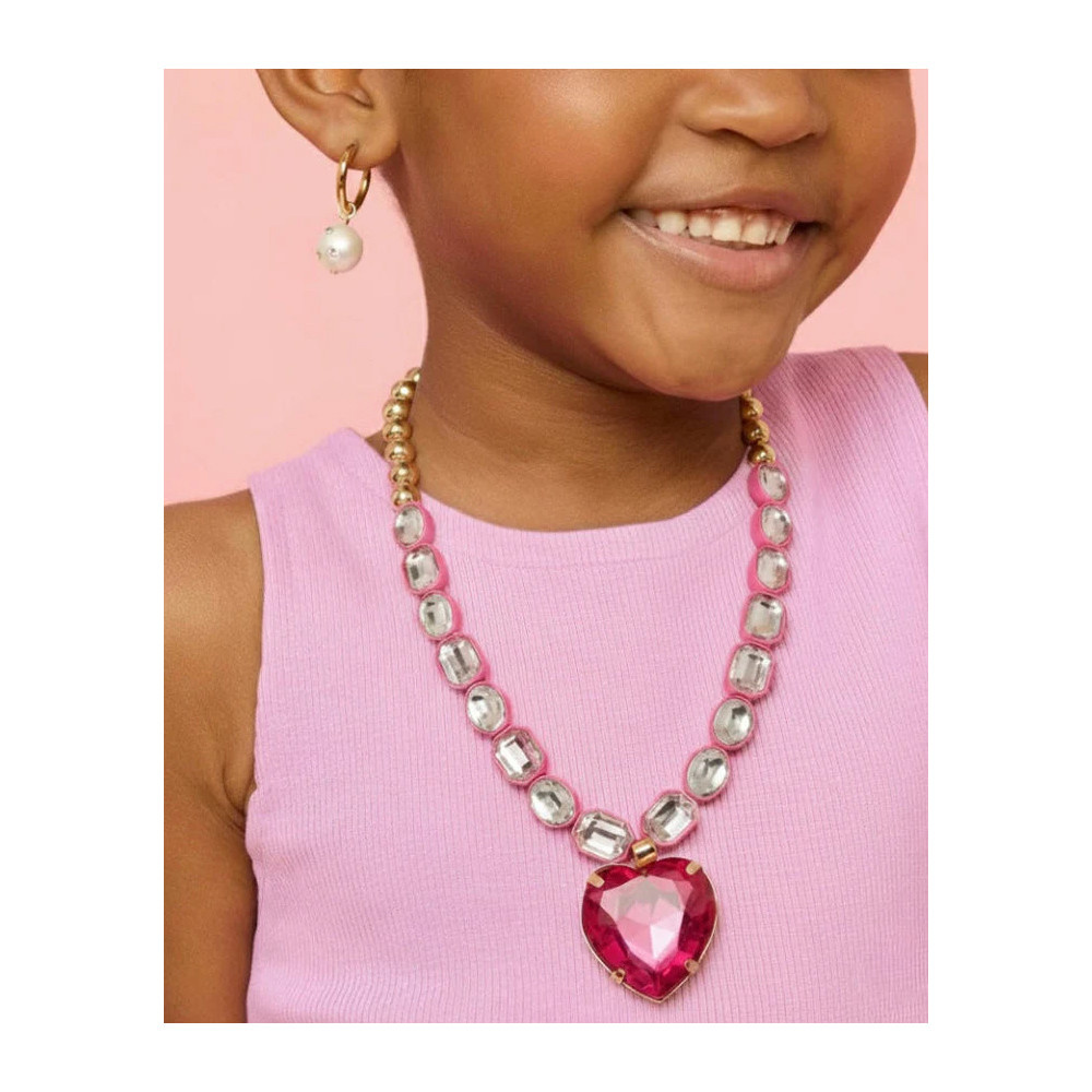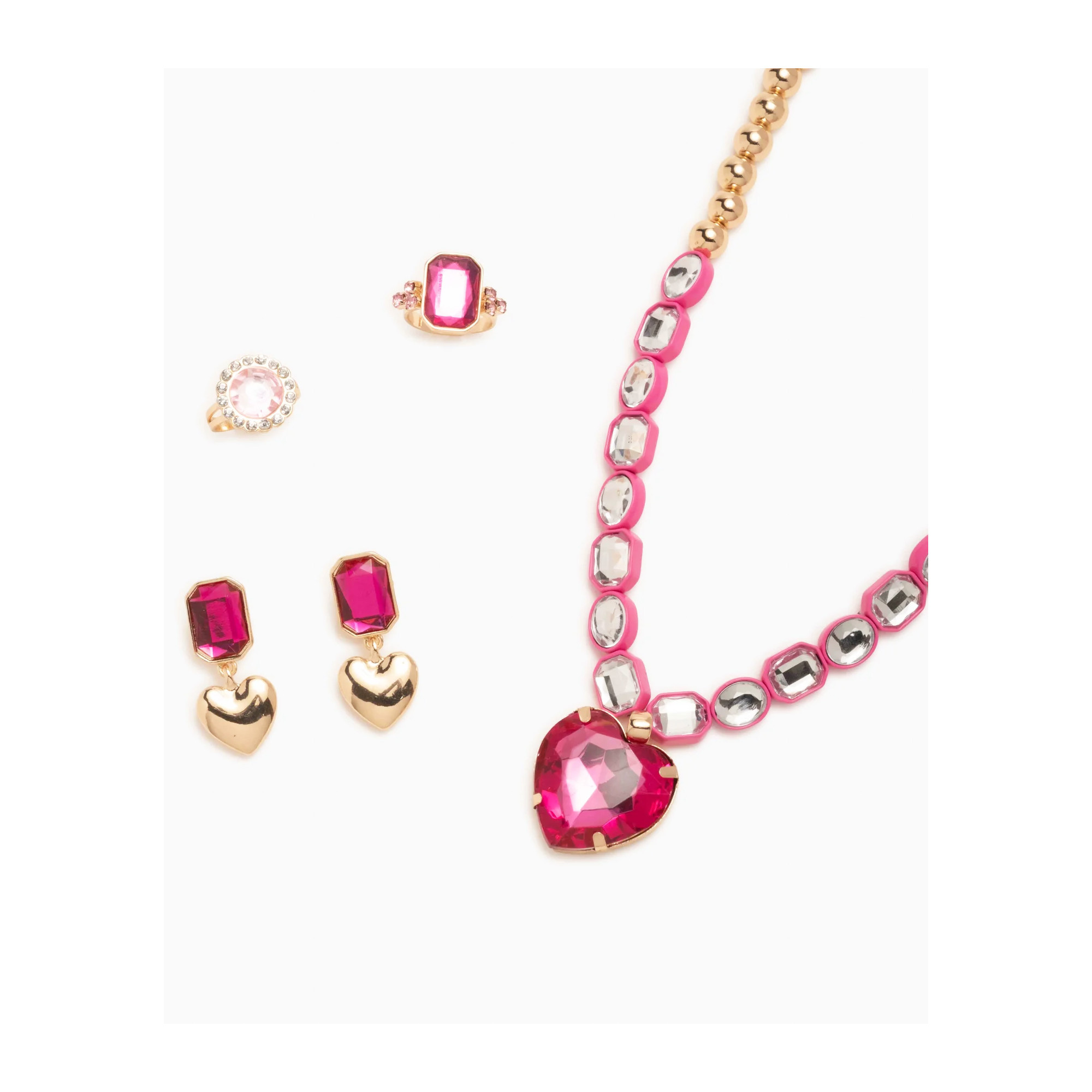 - Set includes one stretchy gem-studded necklace with an oversized fuchsia heart pendant, one pair of pink gem clip-on earrings, and two adjustable rings