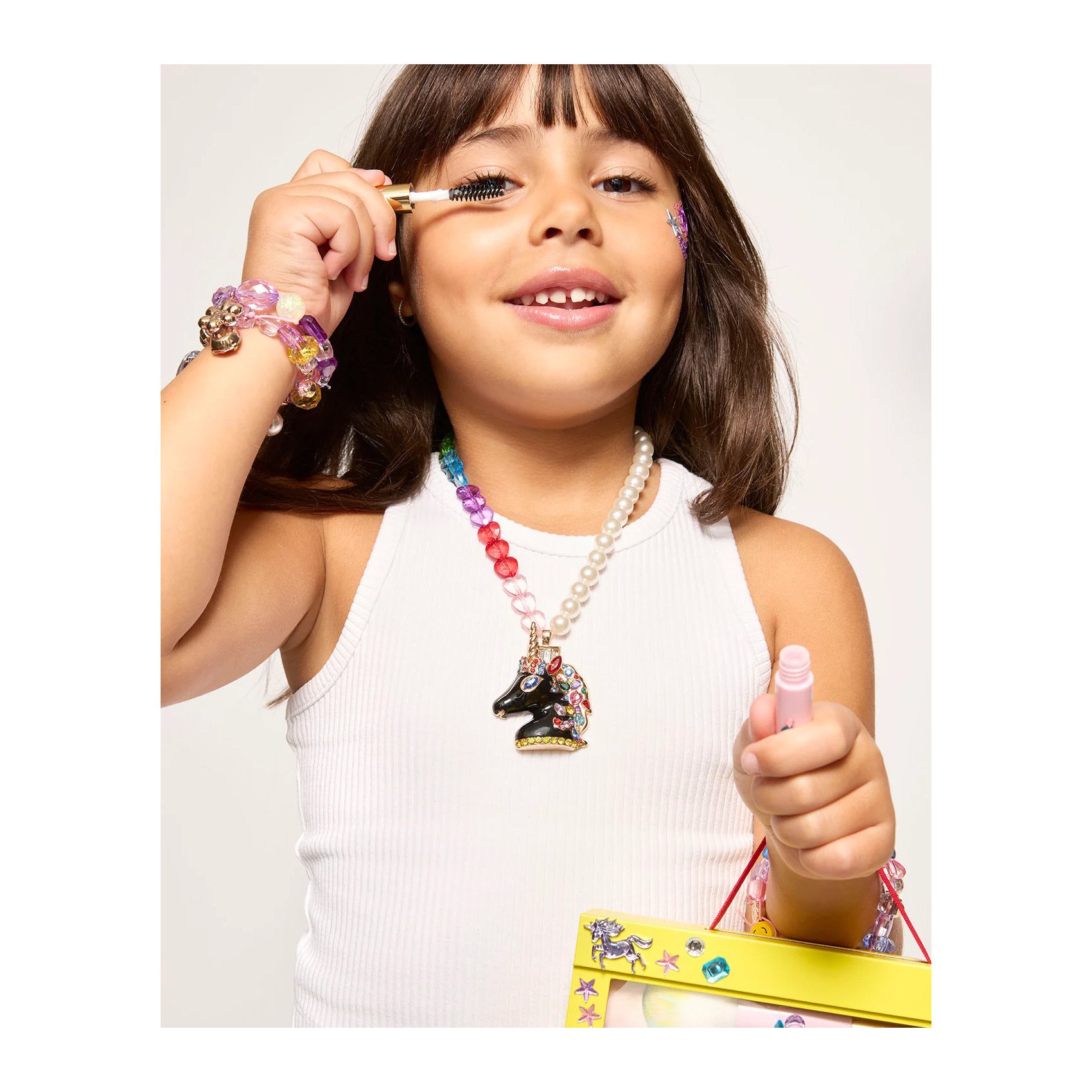 Unicorn Makeup turns dress-up time into a canvas for creativity. Kids can play with pearly pastels, soft sparkles, & sheer pops of color. All designed for imaginative play that goes on sheer.. Easy clean formulas & stickers so they can decorate.