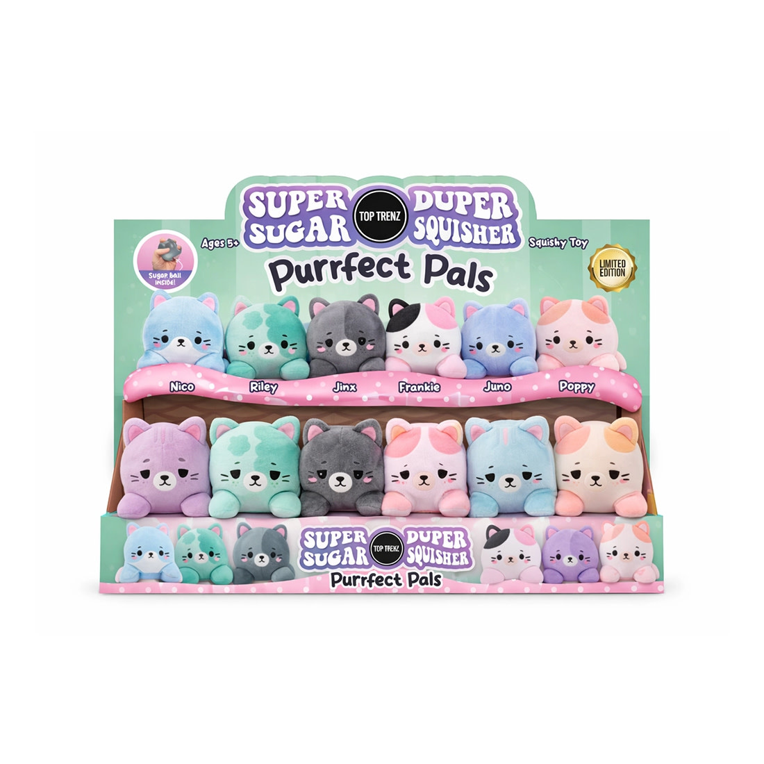 Meet Plush Puurfect Pals, the newest cat-shaped addition to the Super Duper Sugar Squisher line. These adorable plush kitties are wrapped around the same satisfying Sugar Ball squish everyone loves, combining extra “aww” factor with serious impulse appeal