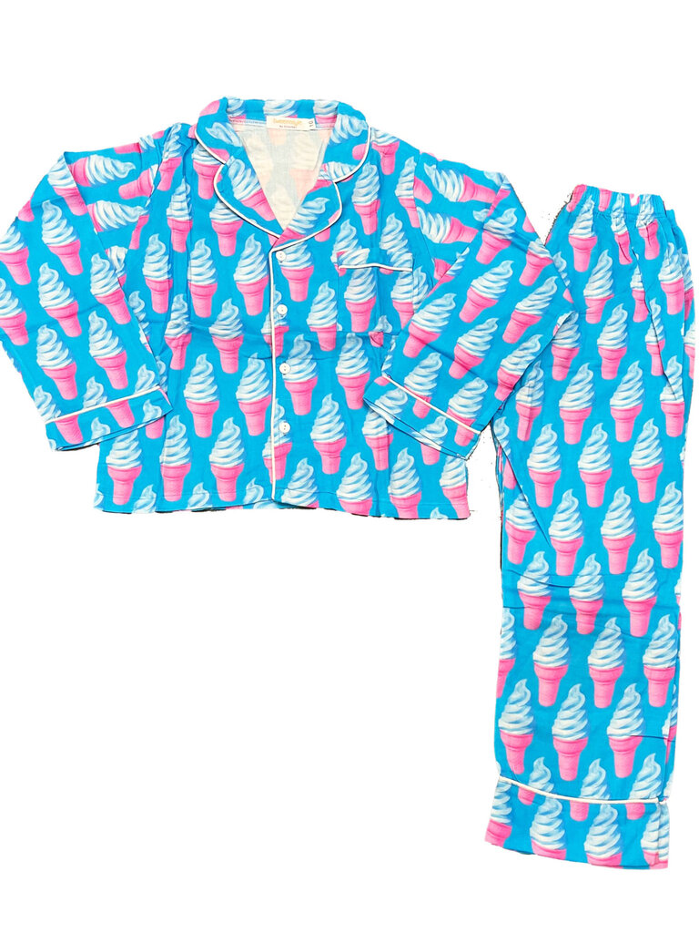 Girls loungewear set from Tweenstyle by Stoopher. Ice Cream Dreams print in a satin poly fabric. Top button closure with elastic waist bottoms.