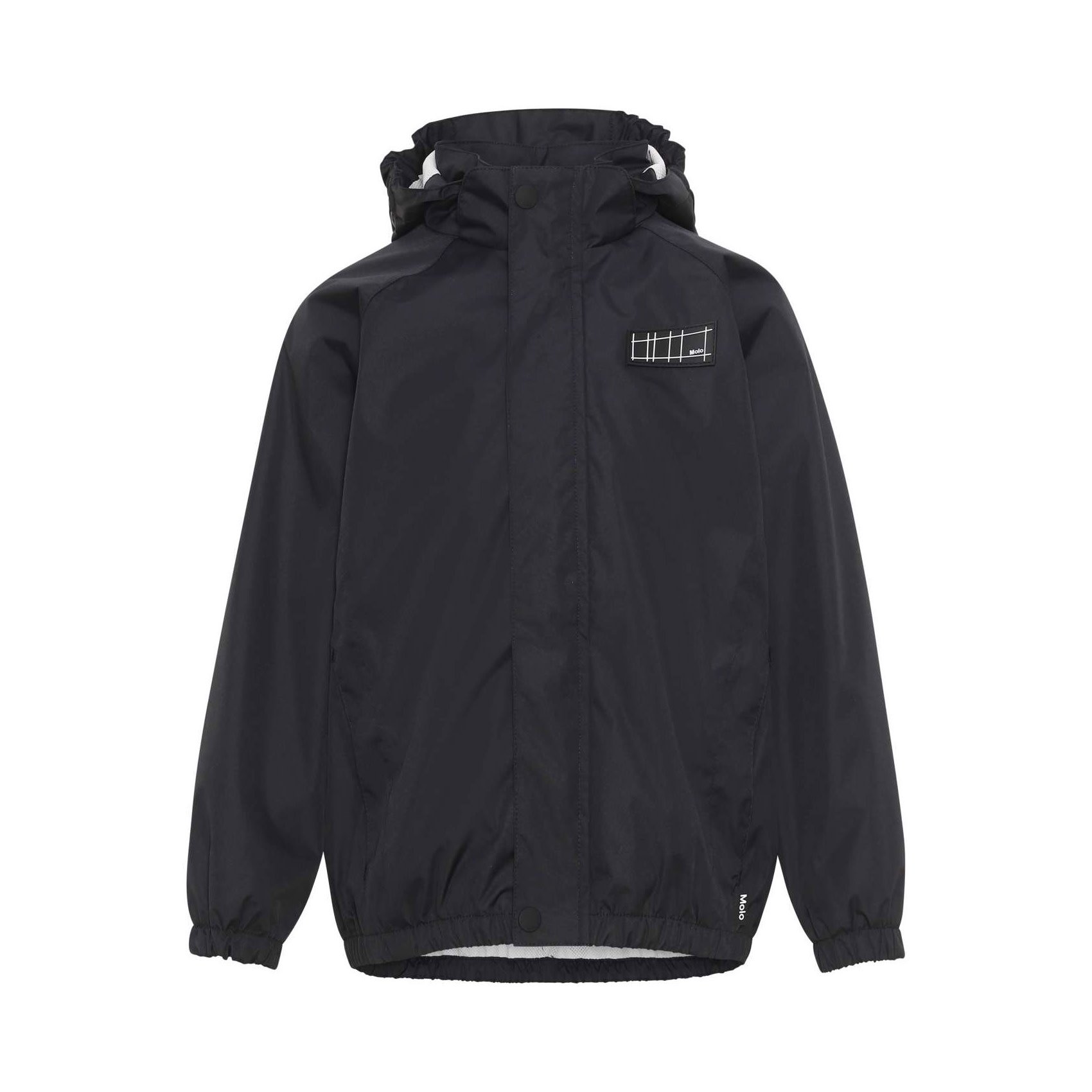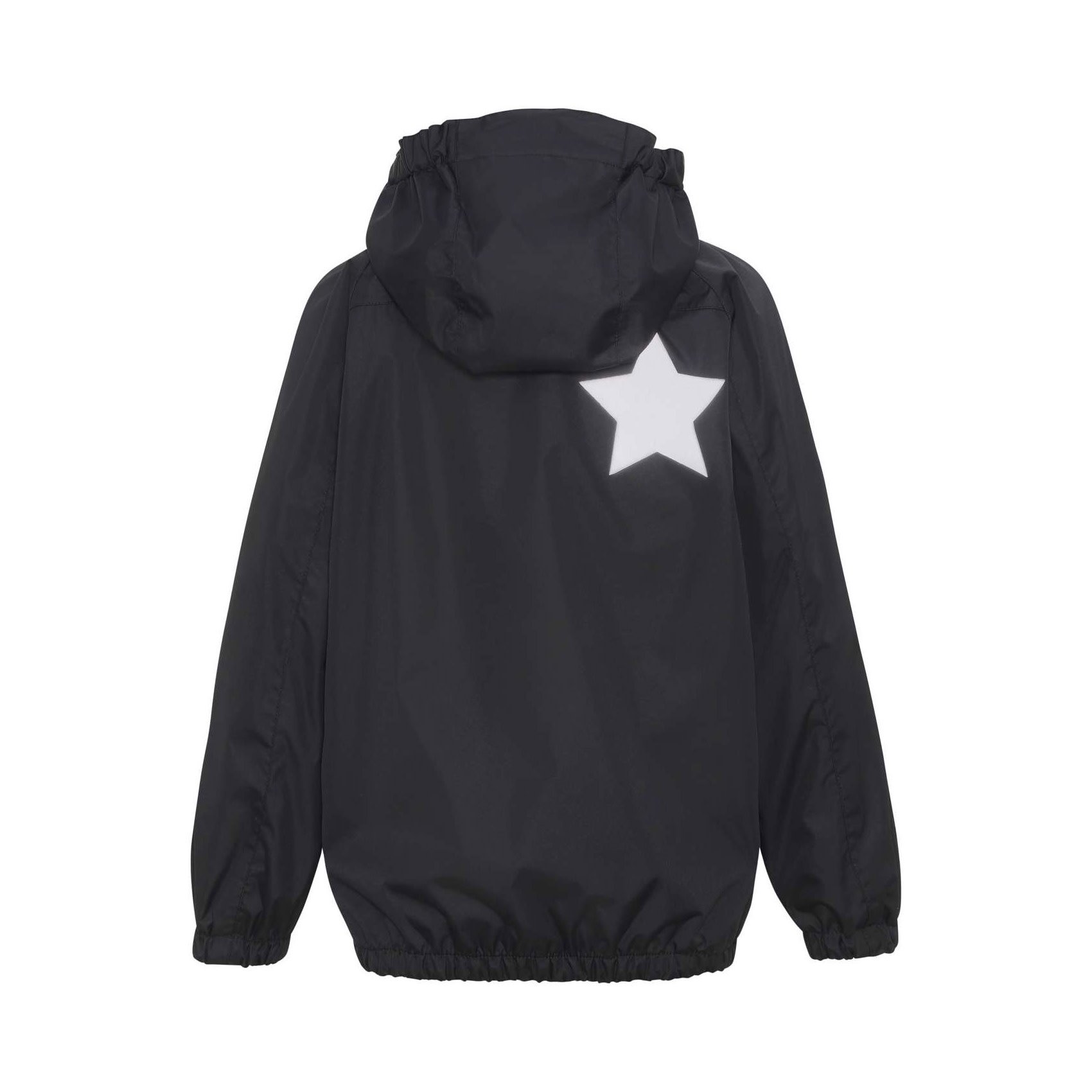 Waiton is a lightweight and functional rain jacket in black with nylon lining. Waiton has a covered zipper to protect against the wind and rain. It has taped seams, detachable hood and two front pockets. The jacket has Molo's iconic star reflector on the