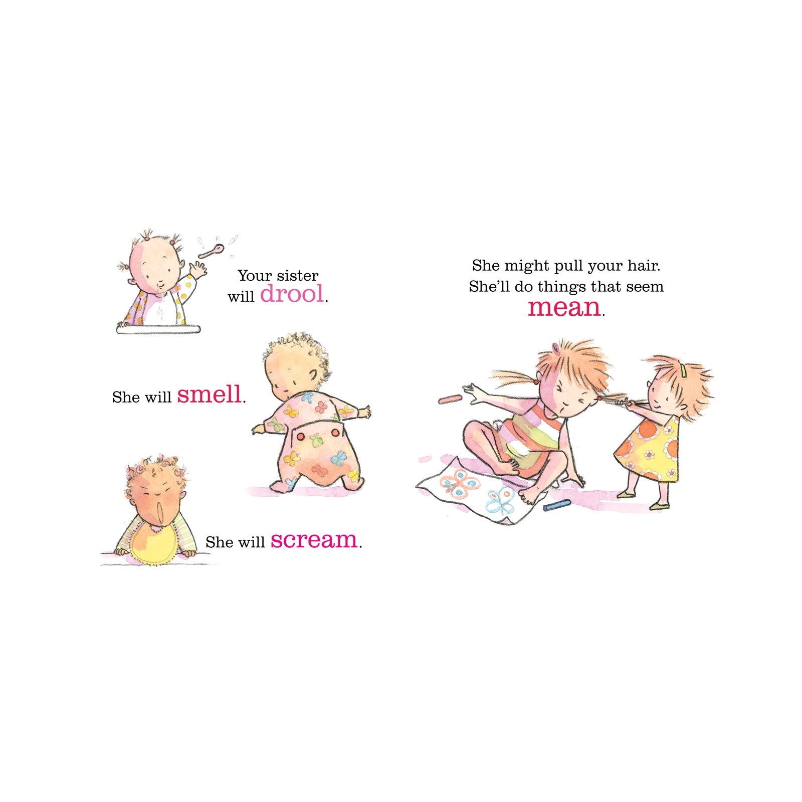 Fortunately for them, this rhyming board book addresses what to expect: “Your sister will drool. She will smell. She will scream. She just might pull your hair. She’ll do things that seem mean.”